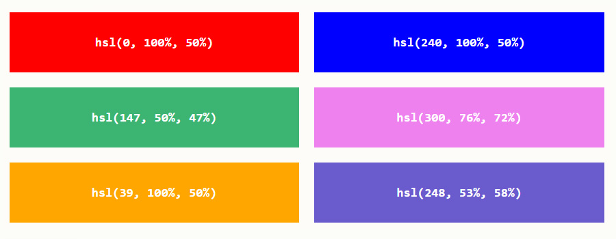 色相(hue)是色轮上从 0 到 360 的度数。0 是红色,120 是绿色,240 是蓝色。饱和度(saturation)是一个百分比值,0% 表示灰色阴影,而 100% 是全色。亮度(lightness)也是百分比,0% 是黑色,50% 是既不明也不暗,100%是白色。
